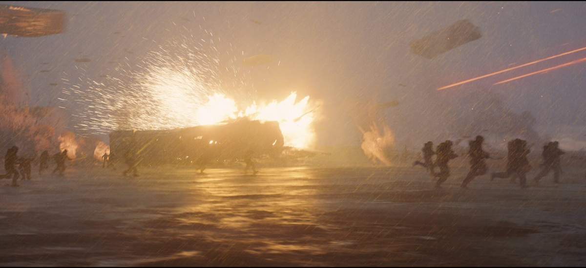 The footage opens with credits as a slow beating of a Fremen Thumper device plays, over time the sound becomes louder as more join the cacophony. The scene shown begins with shots we saw in the 70mm IMAX trailer of rectangular ships descending upon a rainy world. One drop ship gets struck by a bolt of lightning and falls out of the sky.