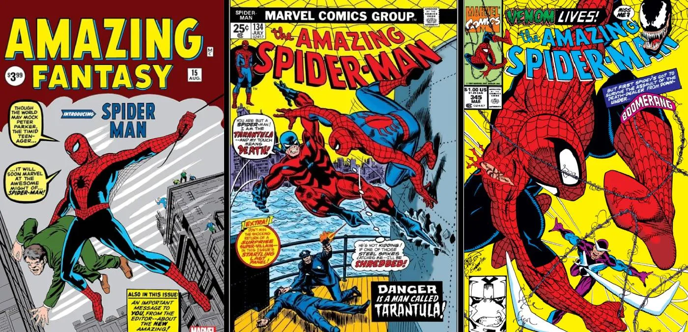 Peter begins running in his Spider-Man suit but without his mask, and then we see a series of comic book inspired shots. One of Peter swinging (Amazing Fantasy #15), one of Peter swinging and fighting Boomerang (The Amazing Spider-Man #345), and one of Peter fighting Tarantula (The Amazing Spider-Man #134 (July 1974)). There is also a shot of Peter fighting The Hand ninjas, who are in red costumes, but we couldn’t find if this was based on a comic or not. The next shot sees Peter in a building and the next few scenes are quite dark so its hard to make out who is where and what takes place.