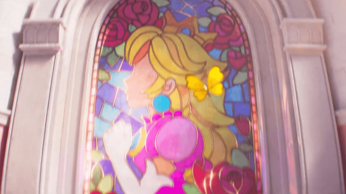 The Butterfly arrives at the Mushroom Kingdom flying upwards. We see the stained glass mural of Princess Peach. The butterfly keeps going, flying past the clouds. In space the logo for the film is shown, the butterfly sits on the letter “M” in Mario. A Luma appears and says “Let’s a Go!” and flies away before the trailer ends.
